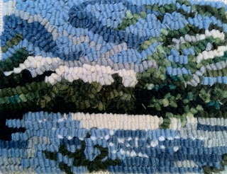 On the hooking front, as I gear up for the next set of workshops, I have been doing a few little mats from photos. And since I want to be able to demonstrate a number of topics that the students are choosing, I did this little landscape. It is only 5 x 6.5", so truly a little sketch. It has yet to be cleaned up and pressed and I can see a little part on the right side that needs to be adjusted. But it's fun to see what detail you can get into something this small with a #6 cut. I think I captured that sparkle on the lake that I love so much.